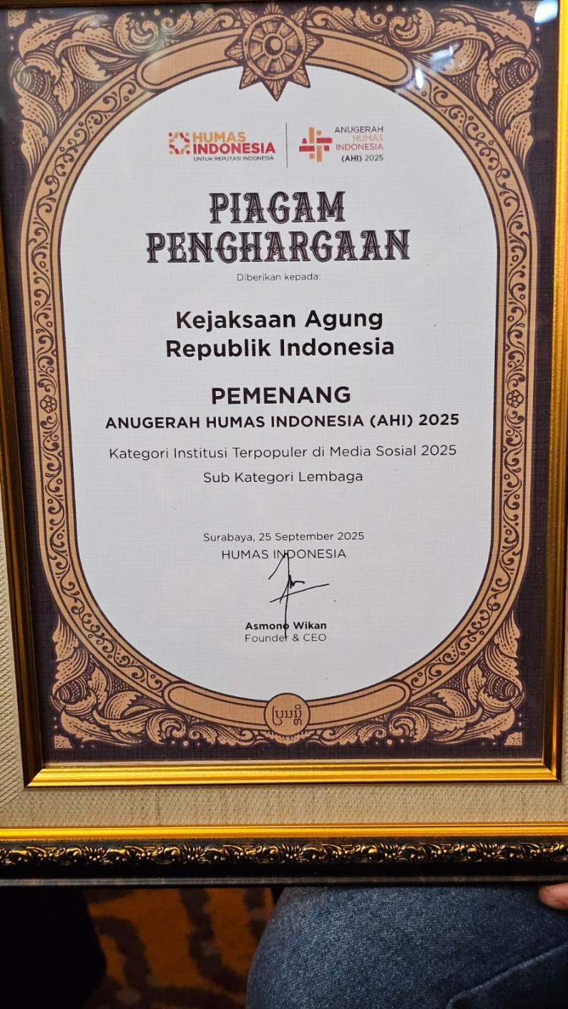 Liputanfokus.com JAKARTA ??? Kejaksaan Agung Republik Indonesia kembali mencatat prestasi membanggakan dengan meraih Anugerah Humas Indonesia (AHI) 2025 pada kategori Institusi Terpopuler di Media Sosial. Penghargaan ini diterima dalam acara yang digelar di JW Marriott Hotel Surabaya, Kamis (25/9/2025).